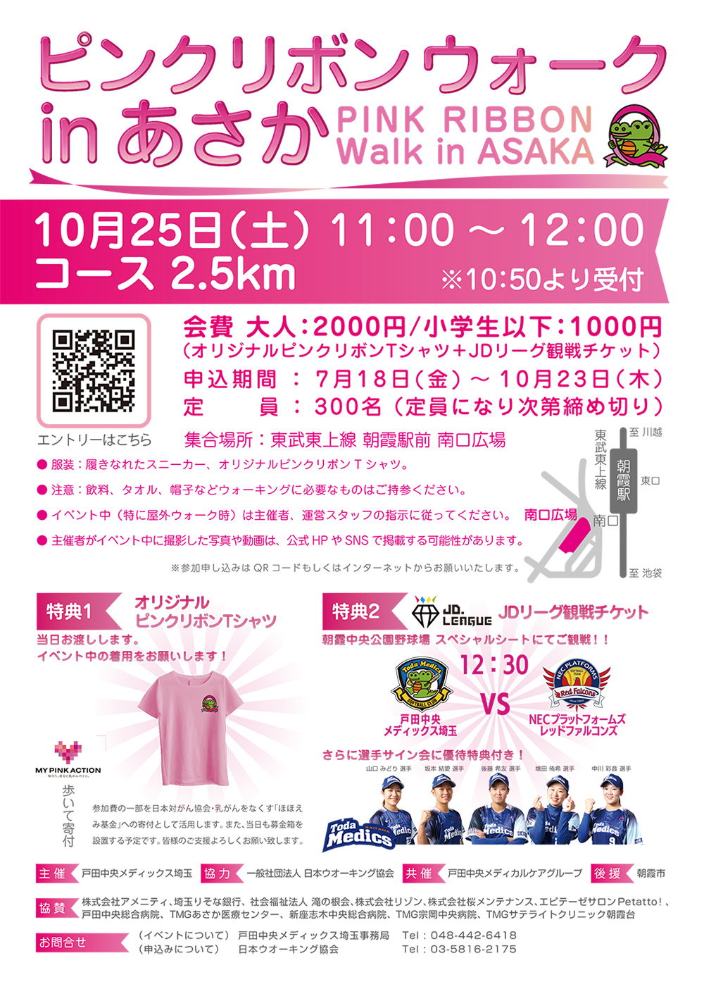 スタート会場となるJR朝霞駅東口広場で受付後、参加賞のピンクリボンTシャツを着て、2.5㎞をウォークしながら乳がん検診の大切さを訴えます。今シーズン、戸田中央メディックス埼玉のホームゲームとなる朝霞ラウンド「朝霞中央公園野球場」がゴールとなり、ゴール会場では乳がんについて知識を深めていただくために、乳がんパネル展示、疑似乳房器による乳がんの触診体験、ブレストケアクイズを行います。またピンクリボンスペシャルシートで「戸田中央メディックス埼玉 vs NECプラットフォームズ レッドファルコンズ」の試合を観戦、特別に選手とふれあえるイベントの開催を予定しています。