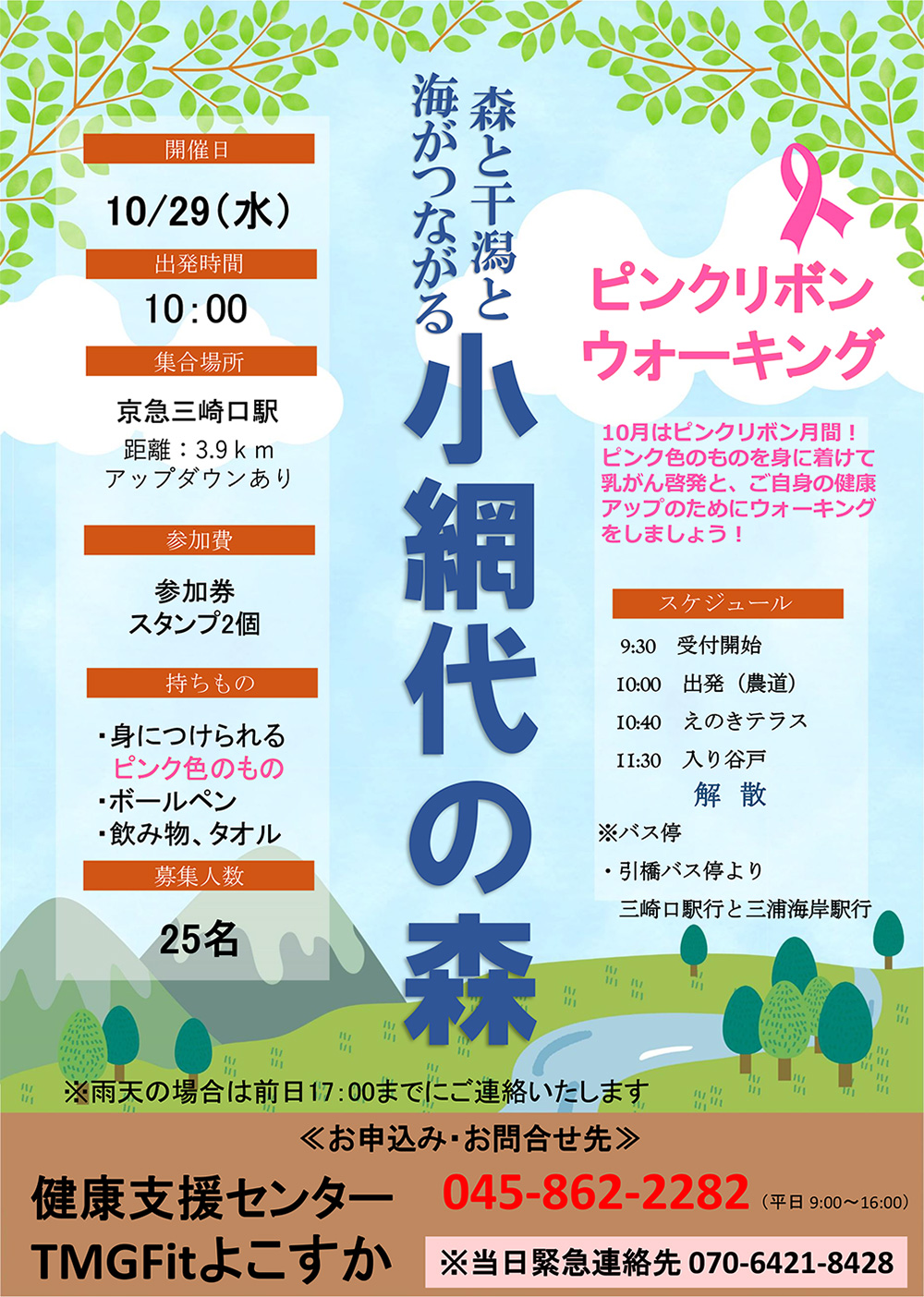 京急三崎口駅より出発し、小網代の森を散策する3.9kmのコースを乳がんに関するクイズや三浦の景色を写真におさめながら楽しくウォーキング。ピンク色のものを身に着けて乳がん啓発とご自身の健康アップのためにウォーキングをしましょう!