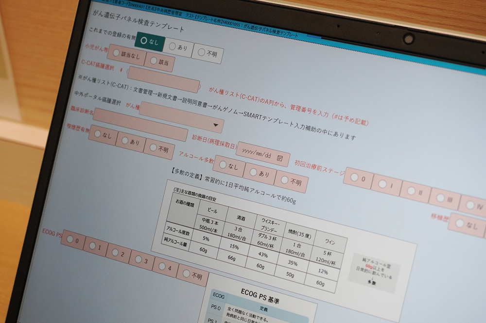 - 最大の特徴は、がんゲノム医療に欠かせない、がんゲノム情報管理センター(C-CAT)への臨床情報入力を電子カルテ内で行えるようにした点です。通常、連携病院ではC-CAT入力専用の端末が限られており、主治医はその端末が設置されている場所まで出向かなければなりません。台数制限やパスワードの共有の制約もあり、入力作業が大きな負担となっていました。当院では電子カルテの中にC-CAT入力画面を組み込み、主治医が自身の診療ブースで直接入力できるようにしました。これにより業務効率が大幅に改善しました。