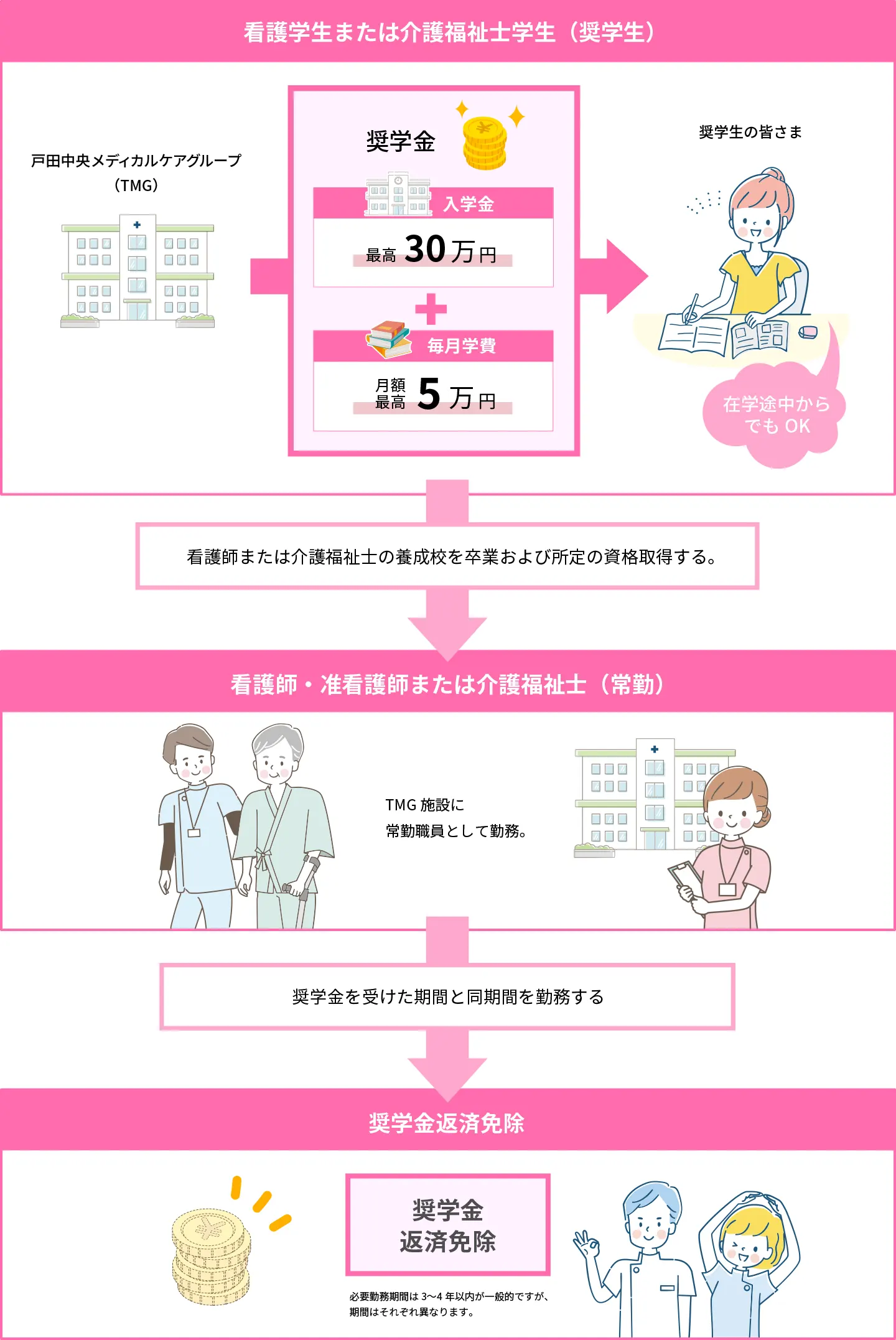 | 対象 | 看護師または介護福祉士を養成する学校に入学し、卒業後、TMGで勤務を希望する人 |