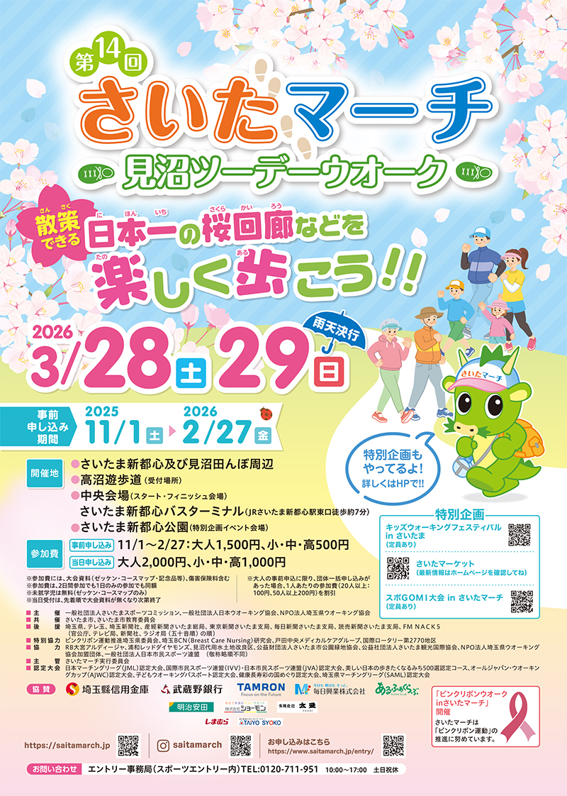 ピンクリボン啓発として、さいたマーチのコース(10km・5km)をピンク色のモノを身に着けて歩きませんか。 会場ではピンクリボンバルーンの配布や、乳がん疑似体験コーナー、乳がんに関するパネルコーナー、プレゼント配布なども行いますので、ぜひ早期乳がん検診啓発の為、一緒に歩きましょう!