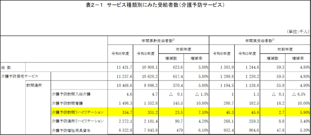 ○ 令和6年度以降も、訪問リハビリテーション(介護予防サービス・介護サービス)は、受給者数が年々増加傾向となっている。
