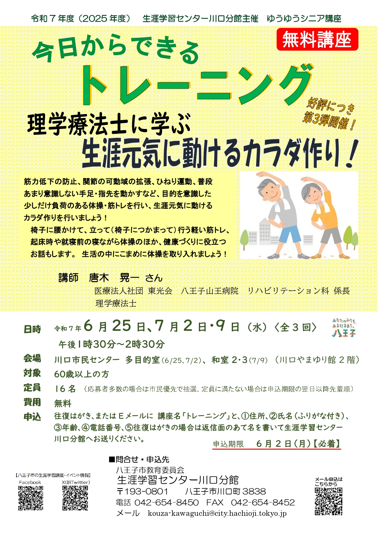 八王子市教育委員会からの依頼で、市民講座として6月から7月にかけて週1回1時間、合計3回の体操講座を開催しました。