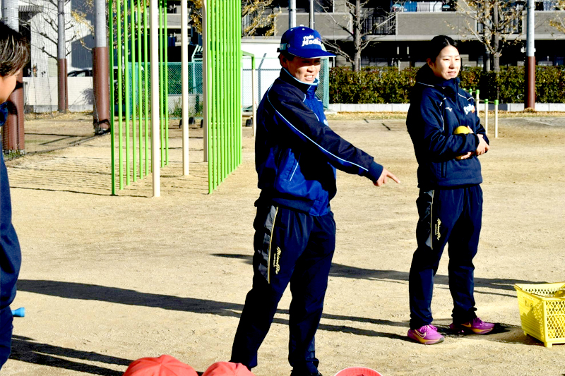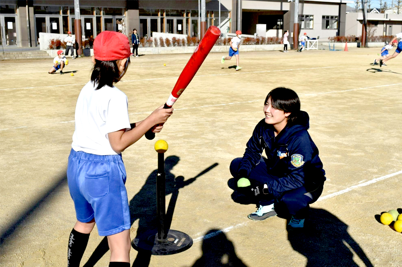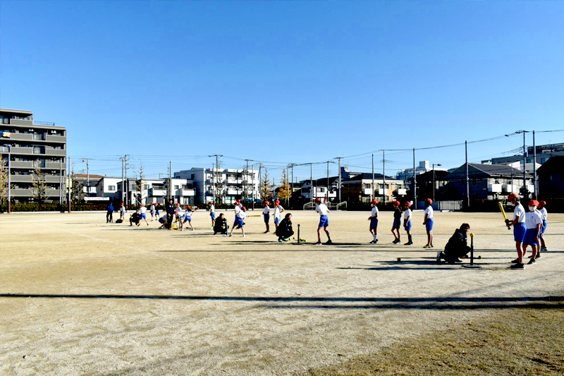 | 内容 | 授業が5回あるうちの1回目。3年時にテニスラケットで大きいボールを打った経験があるためバットにボールが当たる確率は比較的高かった。しかし、ボールを遠くに飛ばすことへの難しさを感じているため5人1グループになり選手が悪い例を交えながら指導しました! |