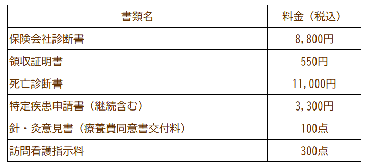 【保険外負担一覧(診断書等)】※その他の文書料は、お問い合わせください。